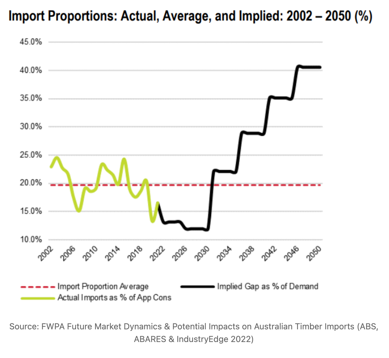 FWPA Forecast 2002–2050: Actual sawn-softwood imports have hovered around 20% of supply (green line), but the implied gap needed to meet demand requires them to rise to 40.5% by 2050 (black line) — more than double today’s level. As the FWPA report notes [8 - at p50]: "By no later than 2031, the requirement for import supply will be permanently above the long-term average proportional contribution of imports. Notably, it is also the case that by no later than 2036, the requirement for import supply will be permanently above the long-term average actual import volume."